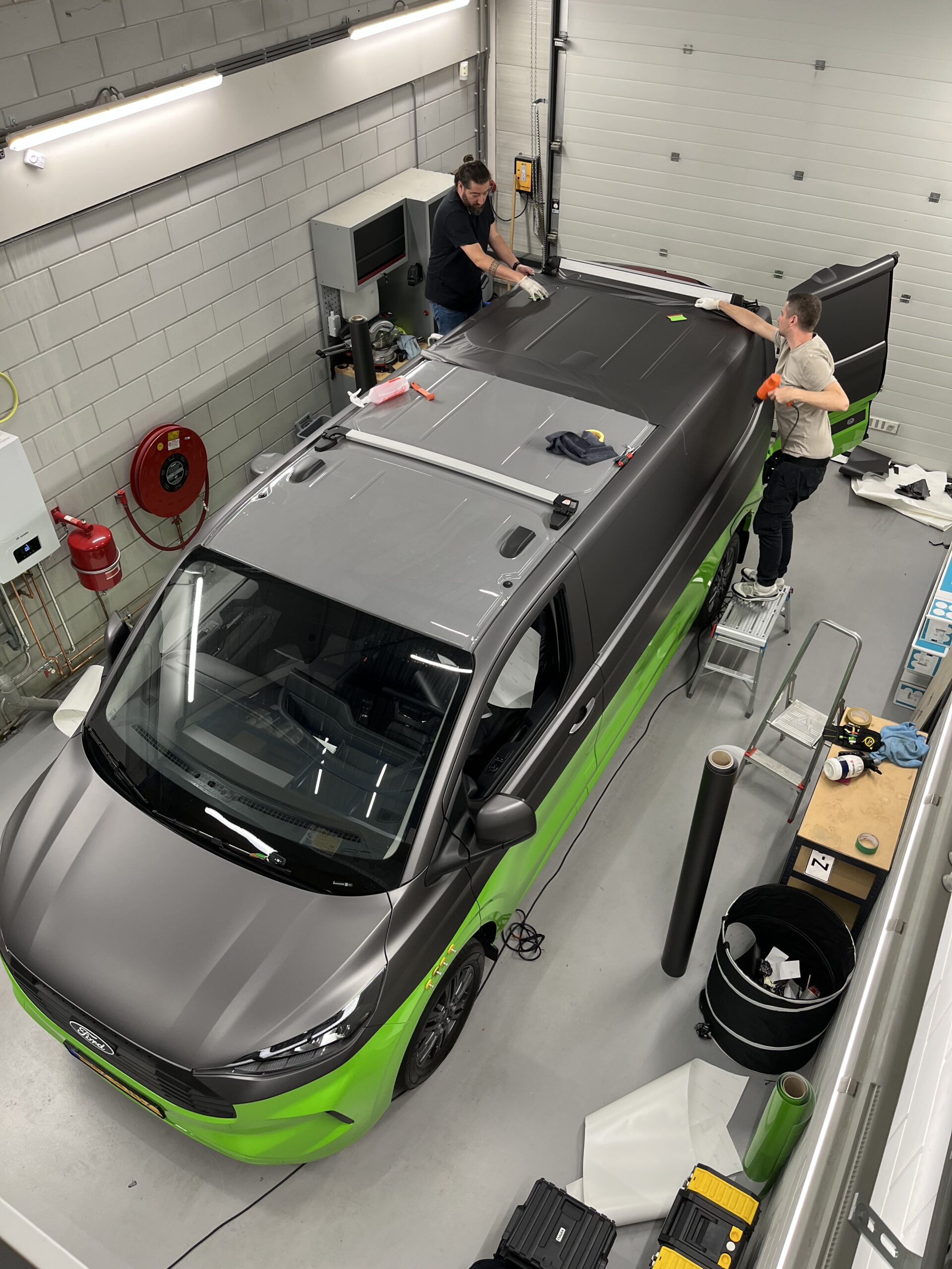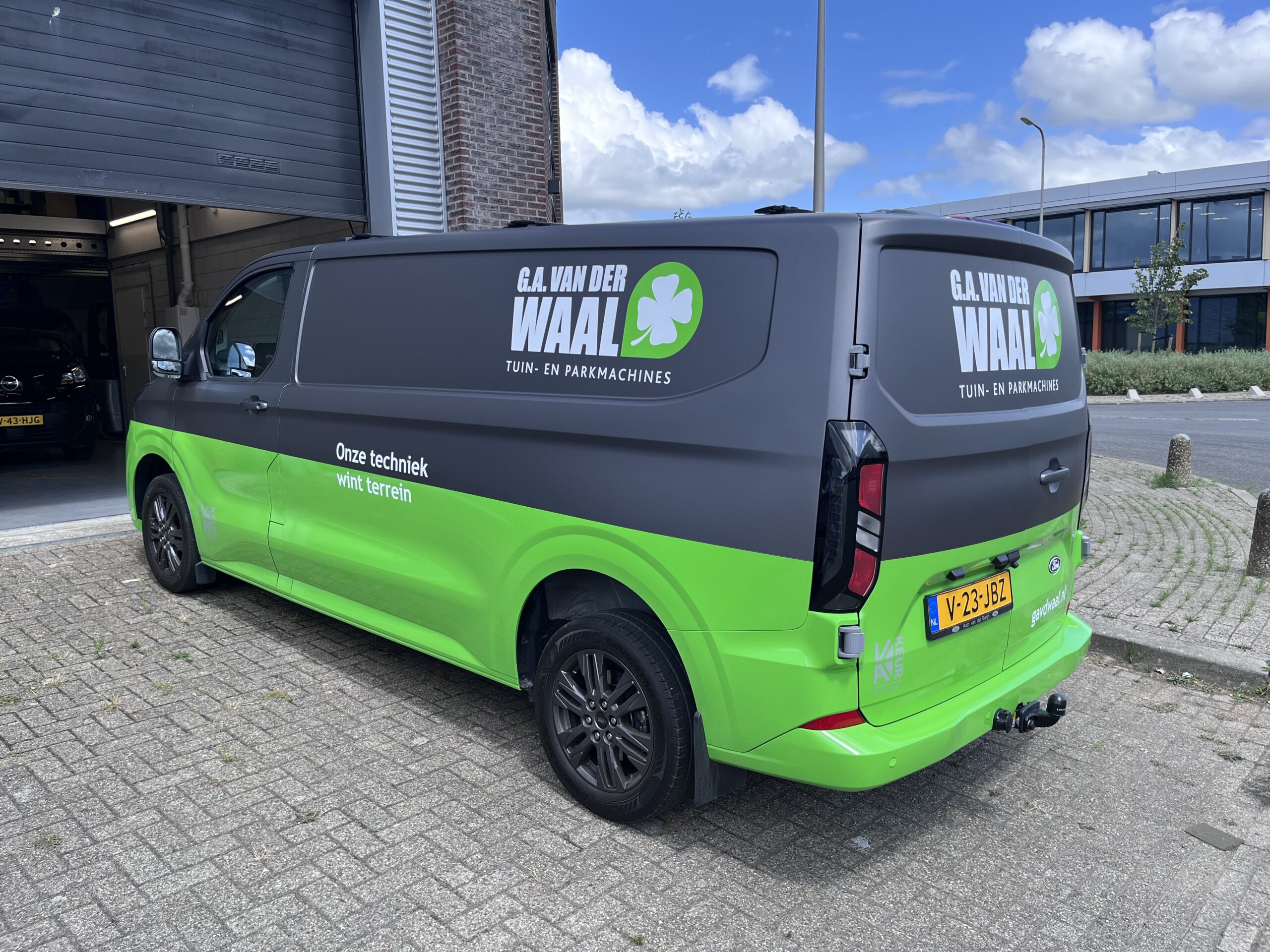 For van der Waal Tuinmachines we were allowed to provide 3 buses with company colors and advertising. The buses are completely wrapped with foil using carwrap technique. We also provided the entire building with beautiful advertising. Various advertising techniques were used for this, such as laser-cut milling texts and foils.
