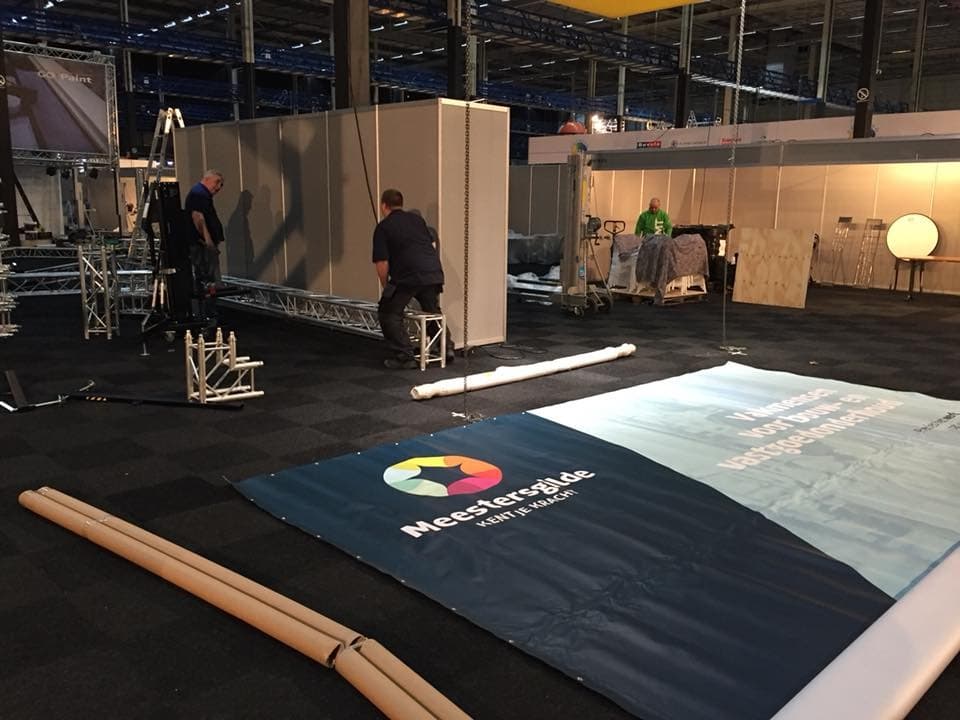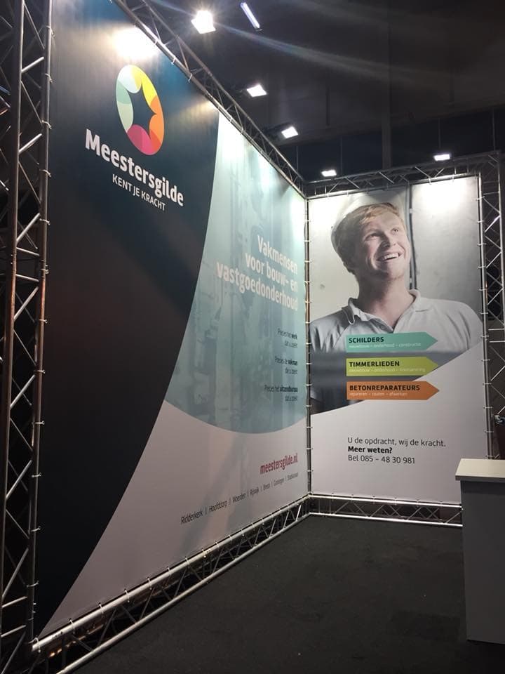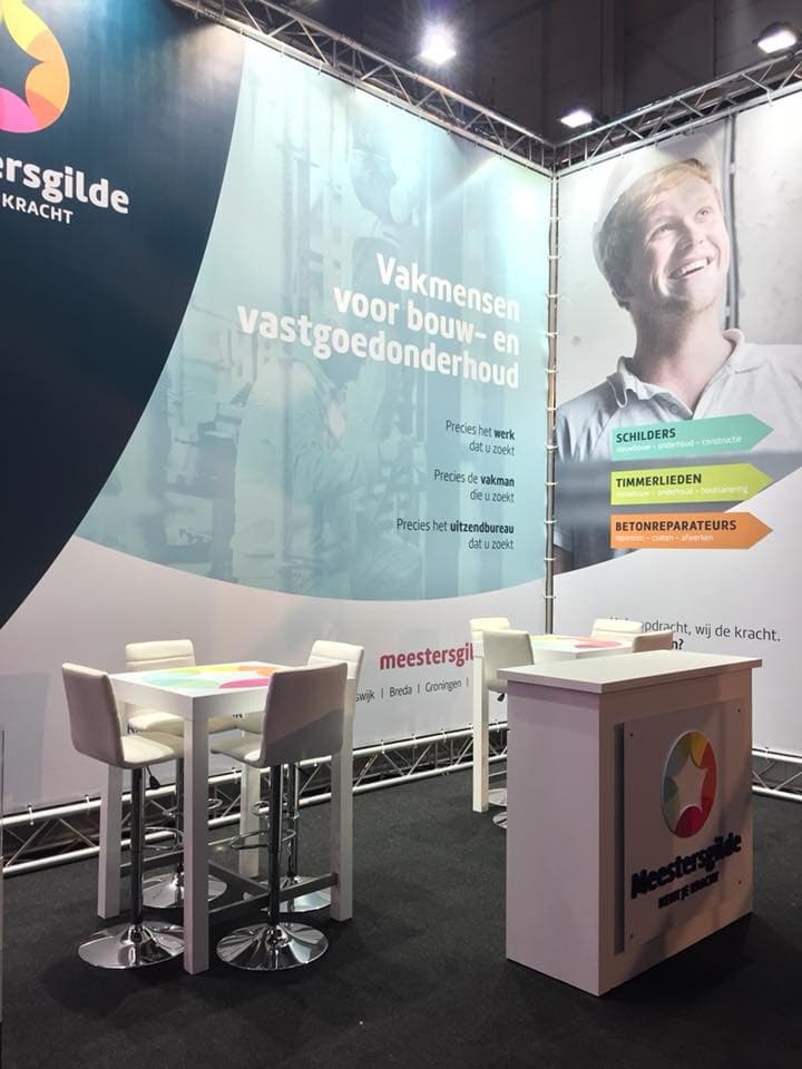 For our client Meestersgilde from Ridderkerk we delivered a beautiful turn-key stand construction project at the SGA Vakdagen in Gorinchem. From the early stages we provided advice on trade fair participation, stand construction and all kinds of issues involved. We delivered the furniture on a rental basis, with some of the furniture having a nice wrap especially for Masters Guild. We also built a tight, high and brightly lit truss system stand where there was a great emphasis on the large visuals. In short, a wonderful all-round project where taking care of all the worries was paramount!